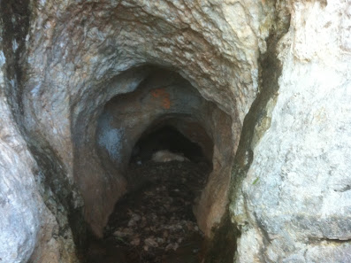 TODA LA MONTAÑA parece claro fue una montaña sagrada / gran santuario, chamánico, socio-cultural religioso REGIONAL, con otras cuevas y puntos que tendrían sus atribuciones, como la tipo SIMA que está en la parte alta (ombligo?), antes de llegar al molino derruido (donde habría con seguridad en esa plana cima UN LUGAR de adoración/OFRENDAS tal que celestial/solar/estelar). La "sima" es una hoquedad vertical ancha que sería lugar de ofrendas-exvotos/sacrificios lanzados desde la vertical al profundo fondo, de carga espiritual negativa TIPO gran POZO de DEMONIOS, en contraposición a la "POSITIVA" de la CUEVA U-V.